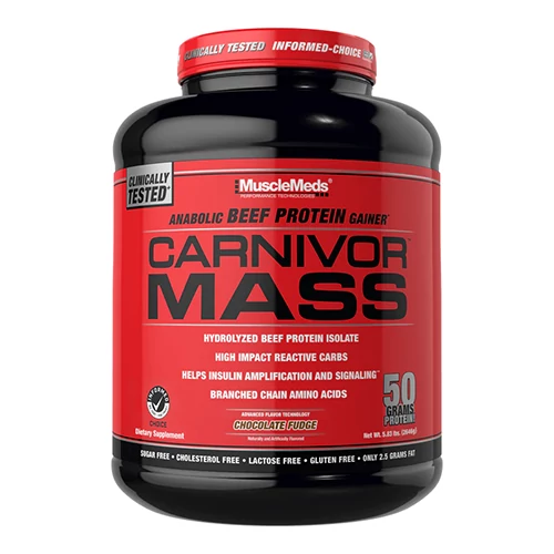 A CARNIVOR MASS-t általában „anabolikus szuperételnek” nevezik, és fejlettebb, mint a tipikus tömegnövelő. Ahol a szokásos élelmiszerek és a tipikus növekedést elősegítő termékek korlátozottak lehetnek a felszívódás sebessége és az inzulin kiugrásának lehetősége szempontjából, a CARNIVOR MASS kiváló. Egyedülálló hidrolizált marhafehérje-izolátumot (BPI) kombinál az iSpike néven ismert, kettős hatású inzulin jelerősítő technológiával. A BPI és az iSpike kombinációja párhuzamosan támogatja a jobb izomanabolizmust, miközben minimalizálja a zsírraktározást. A CARNIVOR MASS egy gyors, tiszta és erősen anabolikus erősítő. Üdvözöljük a tömegnövelés új korszakában a CARNIVOR MASS-szal, a gyors, tiszta, erősen anabolikus tömegnövelővel!