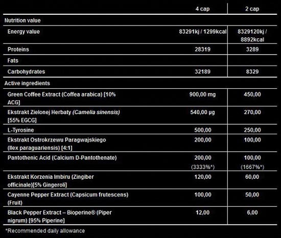 Speciális összetevők hatékony kombinációja, mely termogenikus hatással bír, így fogyasztása hozzájárul a testtömeg csökkentéséhez. Különösen hatékony a bőr alatti zsírszövetek csökkentésében, fogyasztásával csökken az étvágy és energikusabbá tesz. Ajánlott mind alacsony, mind magas aktivitású emberek számára.
