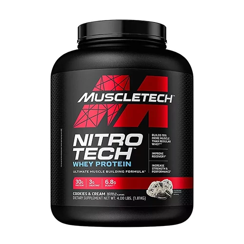 A NITRO-TECH fehérjéket tartalmaz, amelyek főleg tejsavóizolátumból származnak, amely a legtisztább fehérjeforrás. Ezenkívül 3 g kreatint tartalmaz, amely támogatja az izomtömeg növekedését és növeli az erőt. Különböző tanulmányok kimutatták, hogy a rendszeres használat körülbelül 15 kg-os javuláshoz vezet a fekvenyomásban, és 2,3 kg-os izomtömeg növekedéshez vezet.